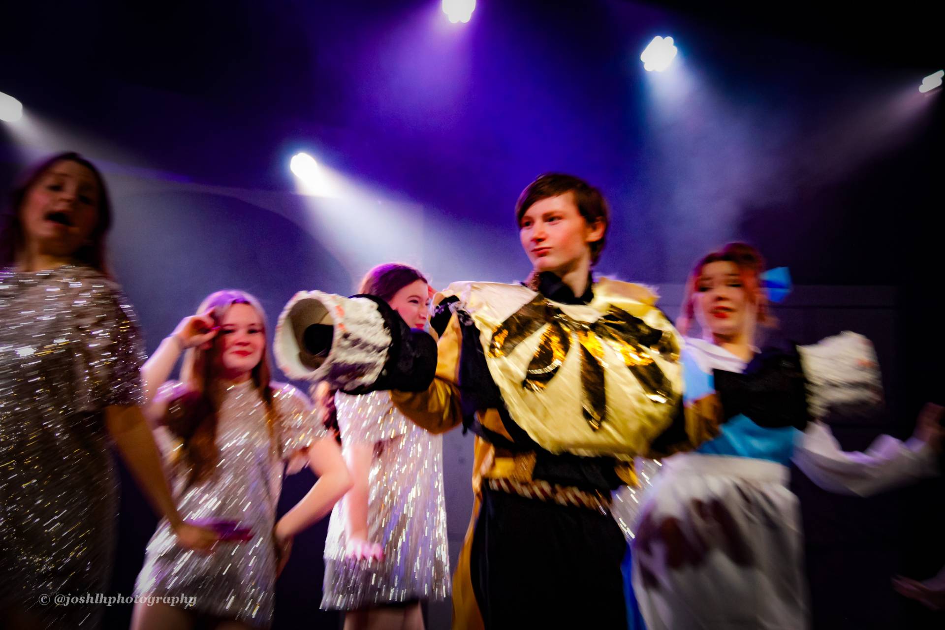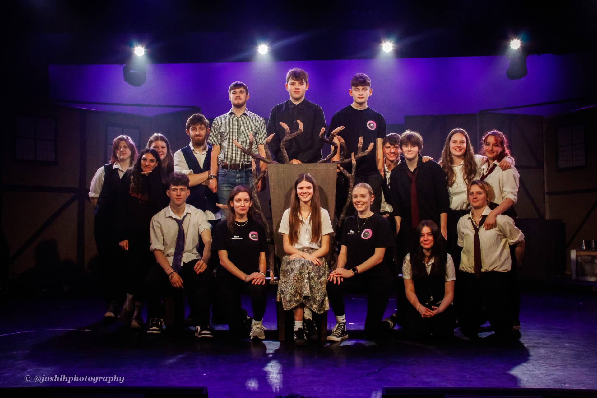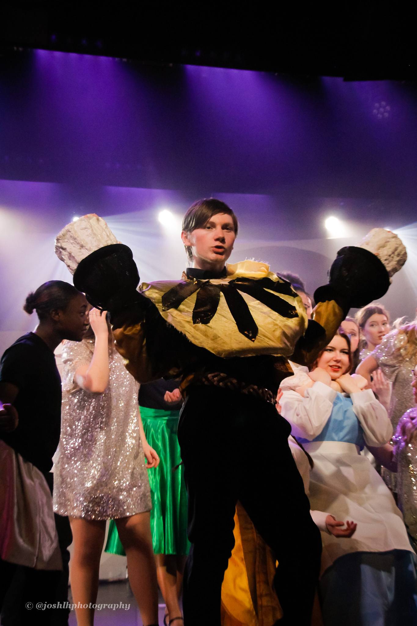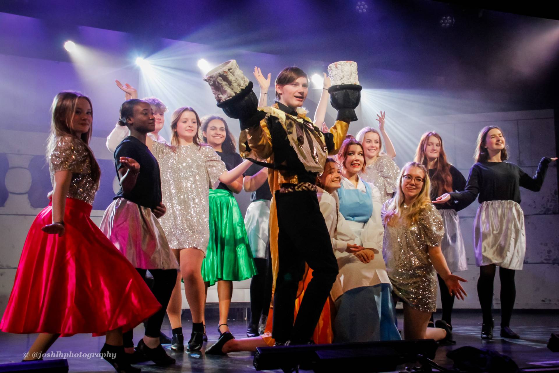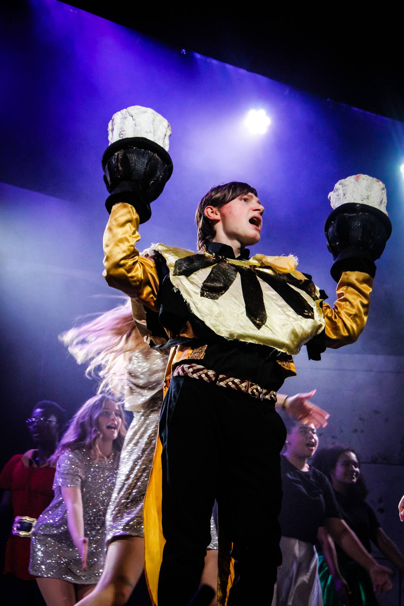 Behind the scenes, students and staff worked tirelessly, with Mark Stratton Performing Arts Technician and Teacher of the Production Arts course overseeing technical aspects, including set design and sound. Stage management students Alex Hammond and Isaac Champion, along with others, handled running the show. Bex Dilley and Beatriz Santos-Goncalves did a fantastic job managing costumes. Nathan Lee and Ollie Funnel contributed to the artistic look and lighting concept, respectively, overseen by Myles Waugh-Bacchus, Central Studio Technician and former production arts student. Teacher of Dance Craig Horton collaborated with student choreographers on the fantastic dance routines , whilst QMC’s vocal coach Ashley Hughes supported Francesco in coaching the ensemble and individual cast members.