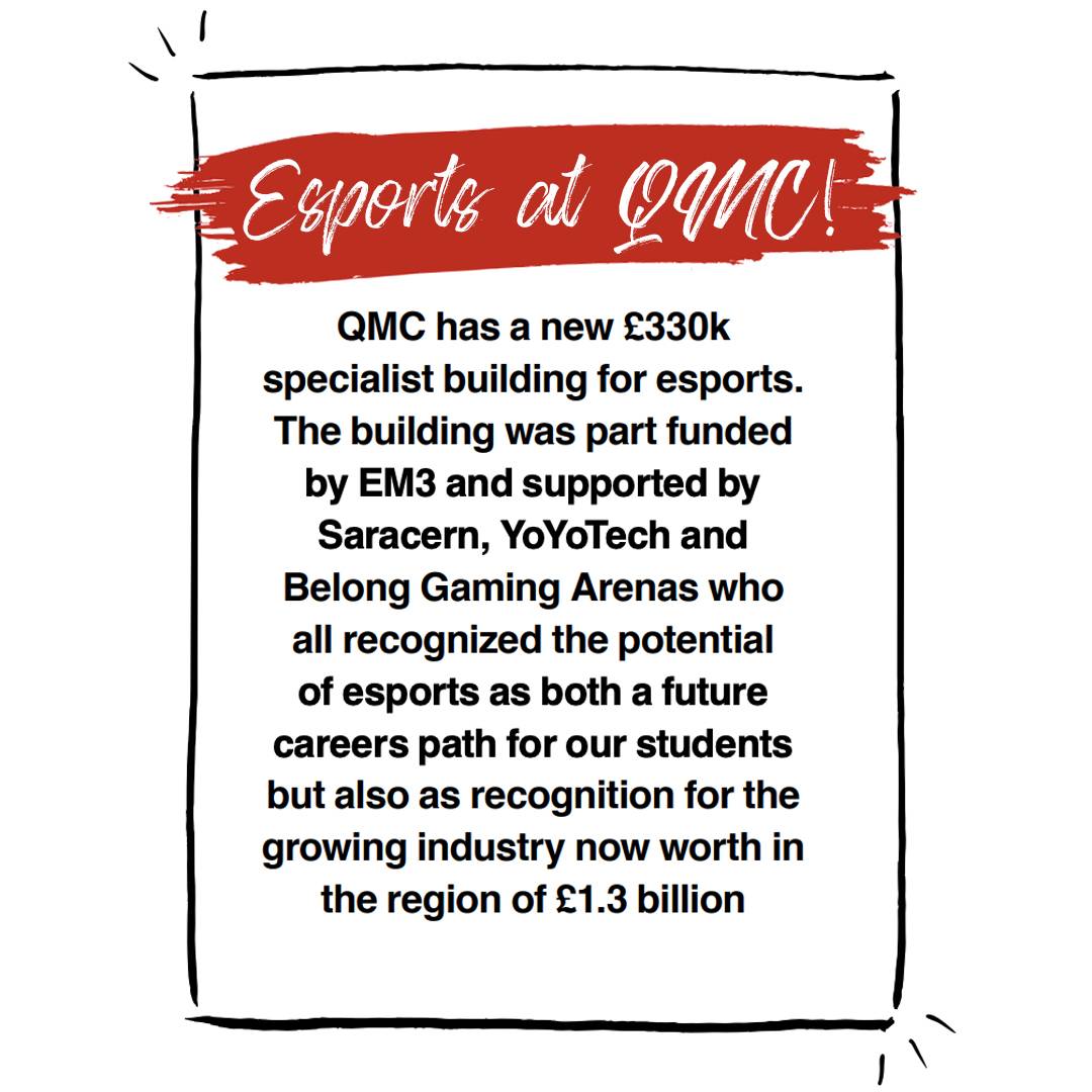 The Esports industry is a burgeoning sector in the UK, particularly concentrated in the South of England. Esports has seen dramatic growth in recent years, creating thousands of new jobs in the entertainment industry worldwide and the current industry is values at over $1.2 billion. As well as in gaming itself, career opportunities are wide and varied and include Event Management, Sales and Marketing, Broadcasting, Coaching, Streaming, Human Resources and many more of the roles typically associated with running large scale businesses that are seen esports as an industry be valued into the high billions. QMC will offer you a unique route into this career and will be led by a national trainer who helped devise the qualification itself.